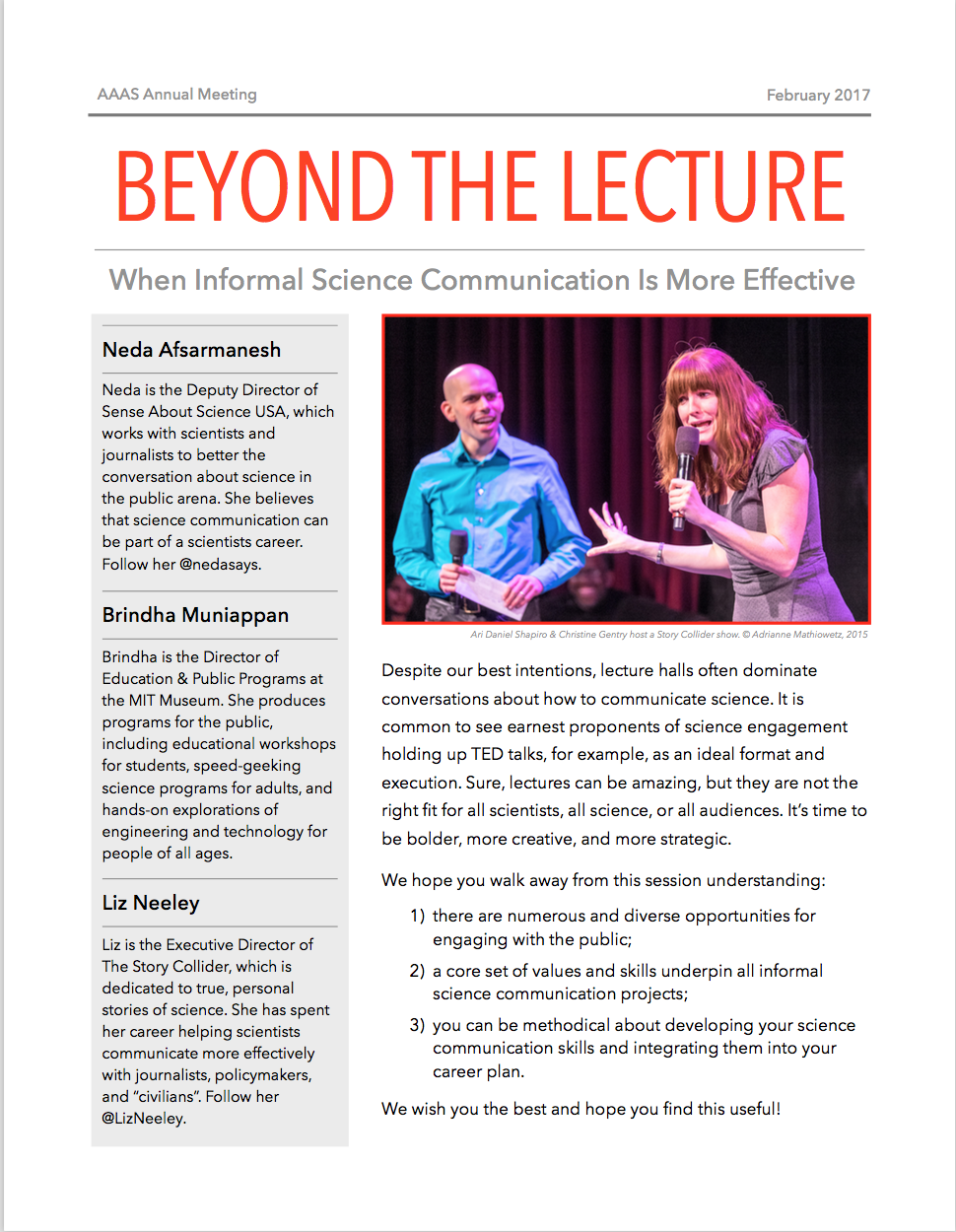 Welcome! This is the resource page for the 2017 AAAS Session "Beyond the Lecture: When Informal Science Communication Is More Effective"