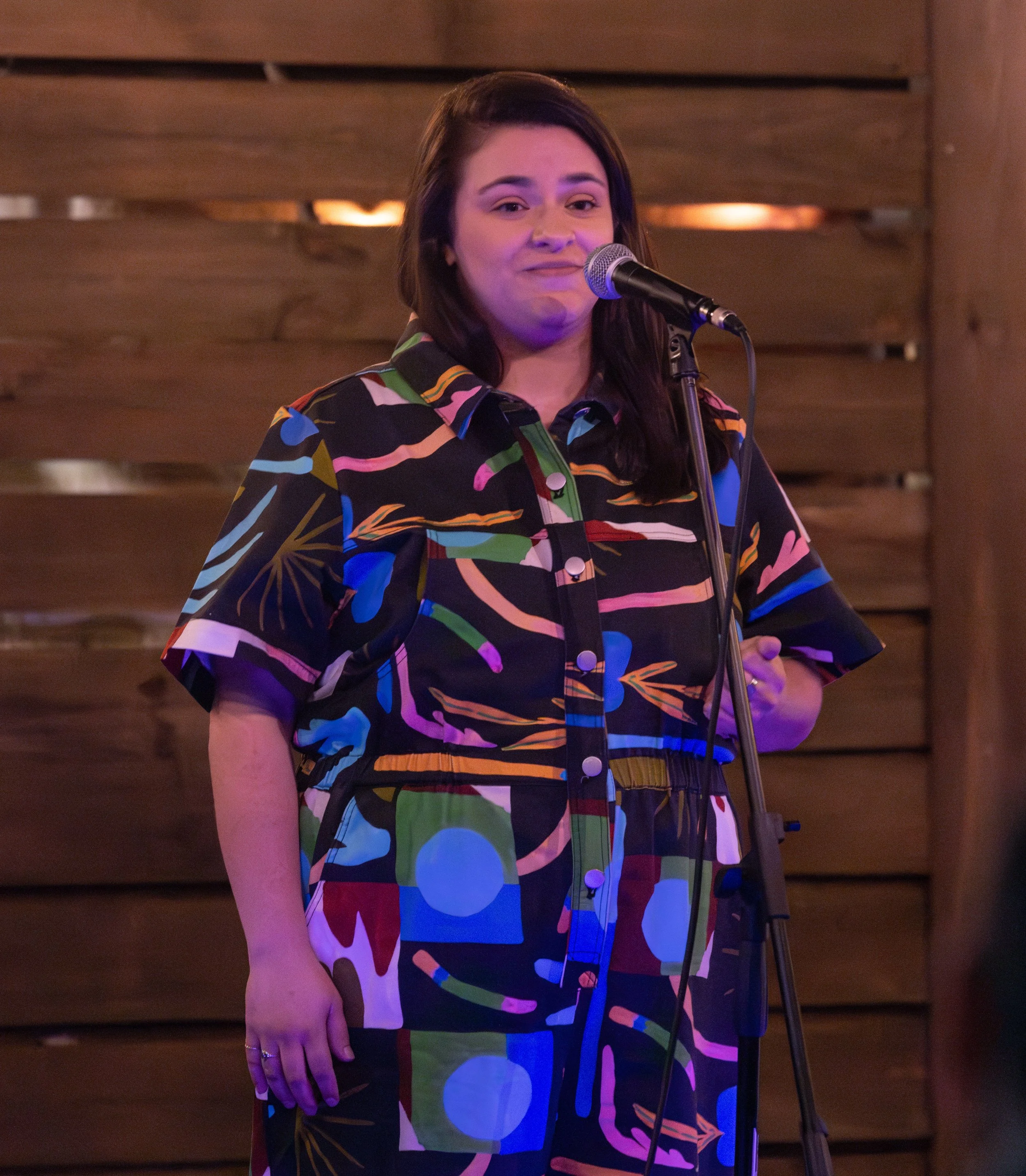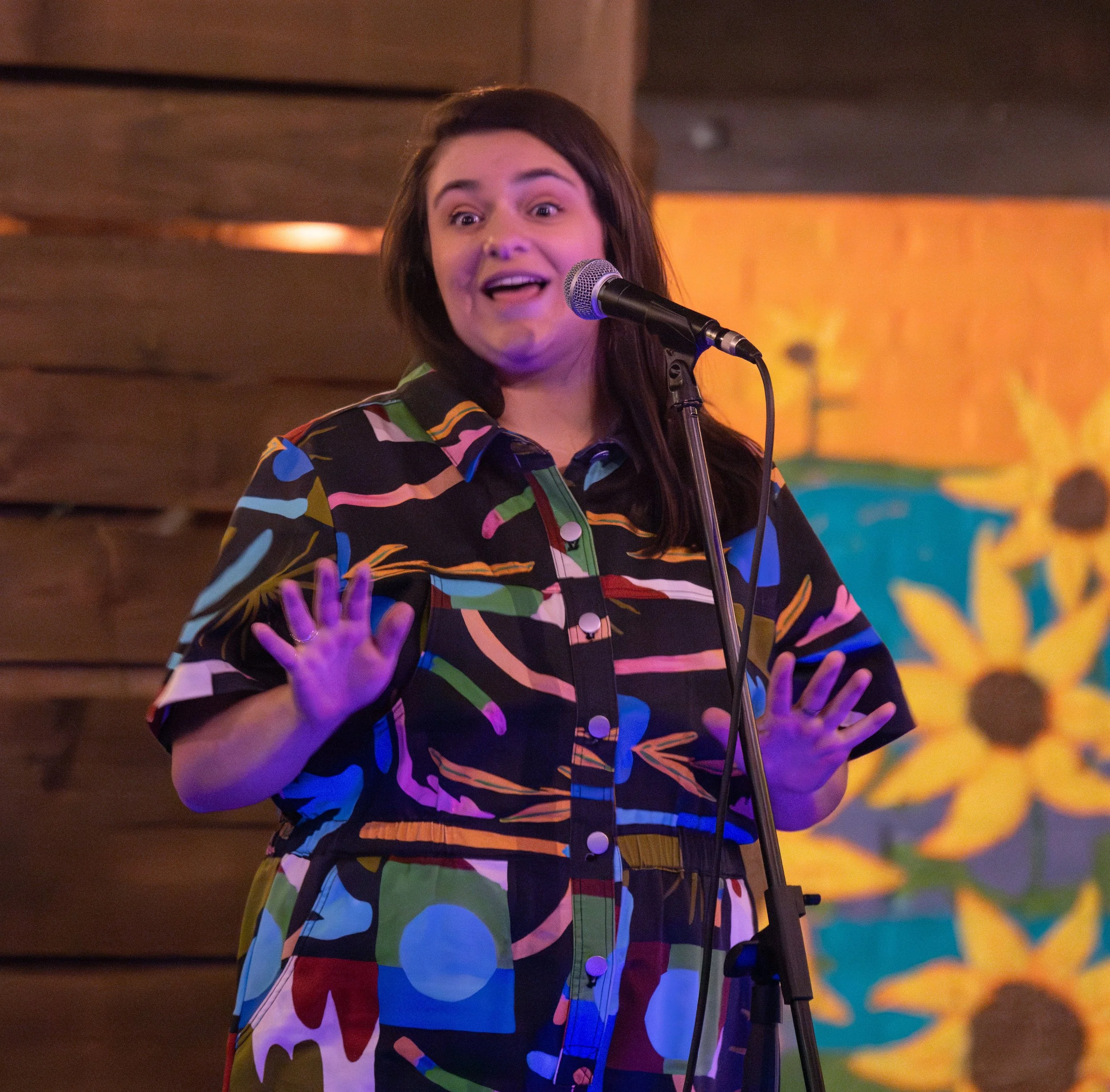 Stella Mayerhoff shares her story at Waller's Coffee Shop in Atlanta, GA at a show sponsored by Science ATL in October 2024. Photo by Rob Felt.