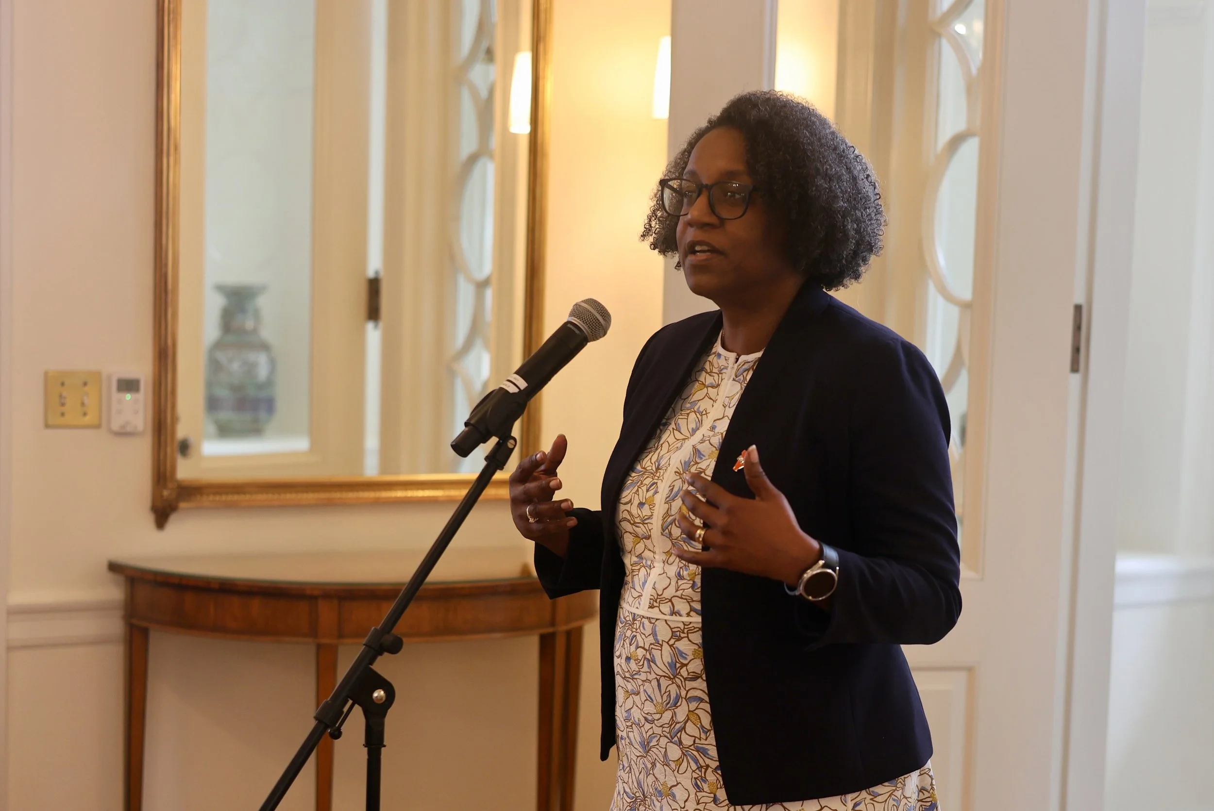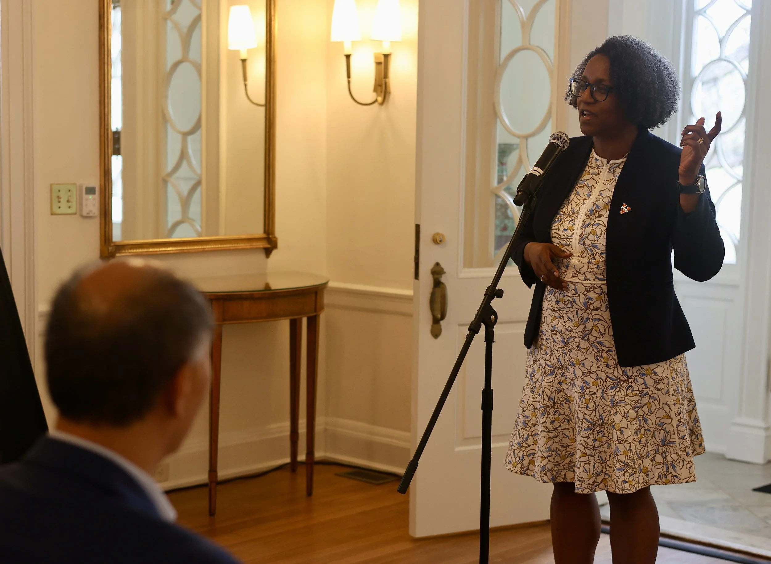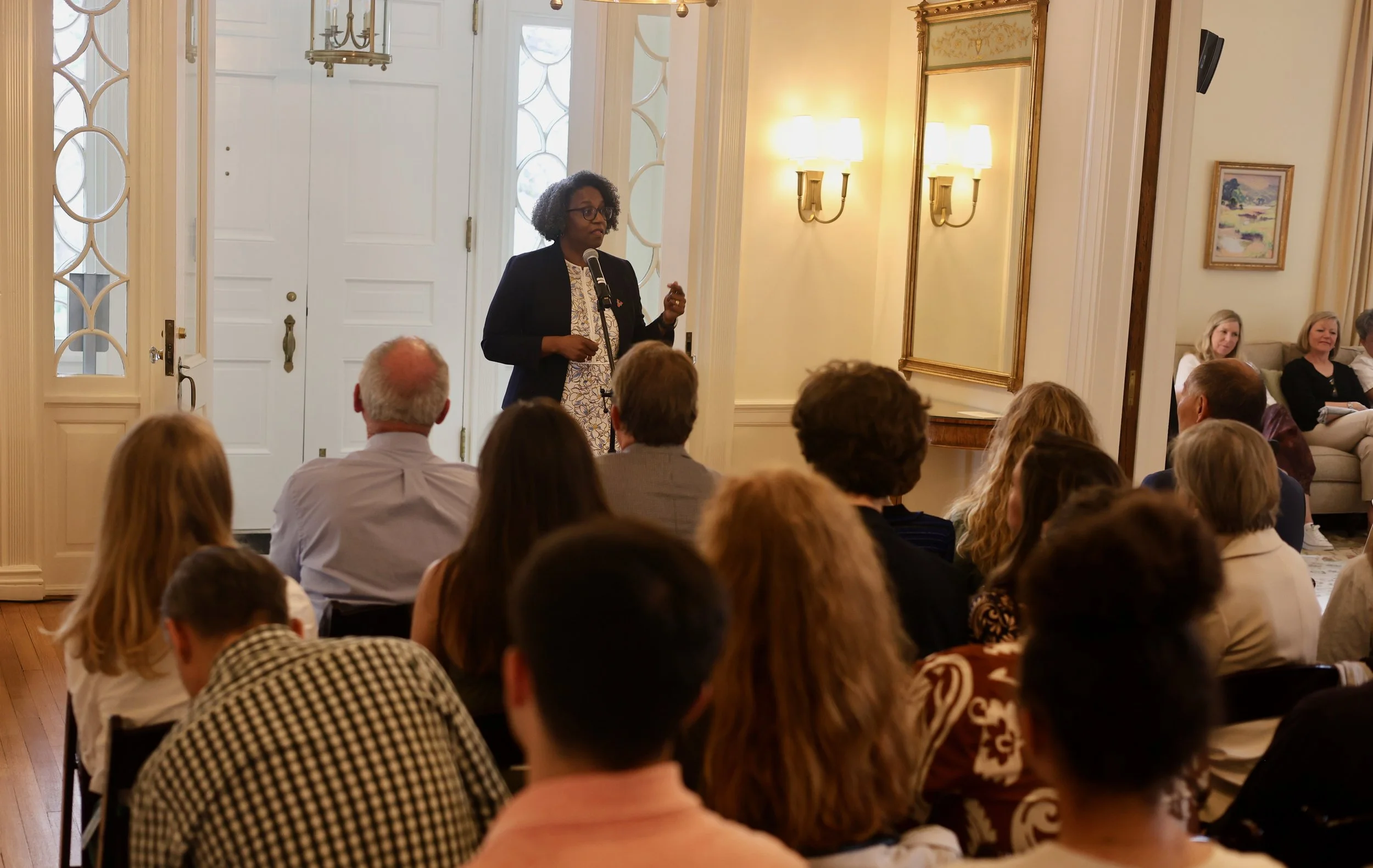 Stephanie Rowley shares her story at Carr’s Hill at UVA in Charlottesville, VA in April 2025. Photo by Meredith Cole.
