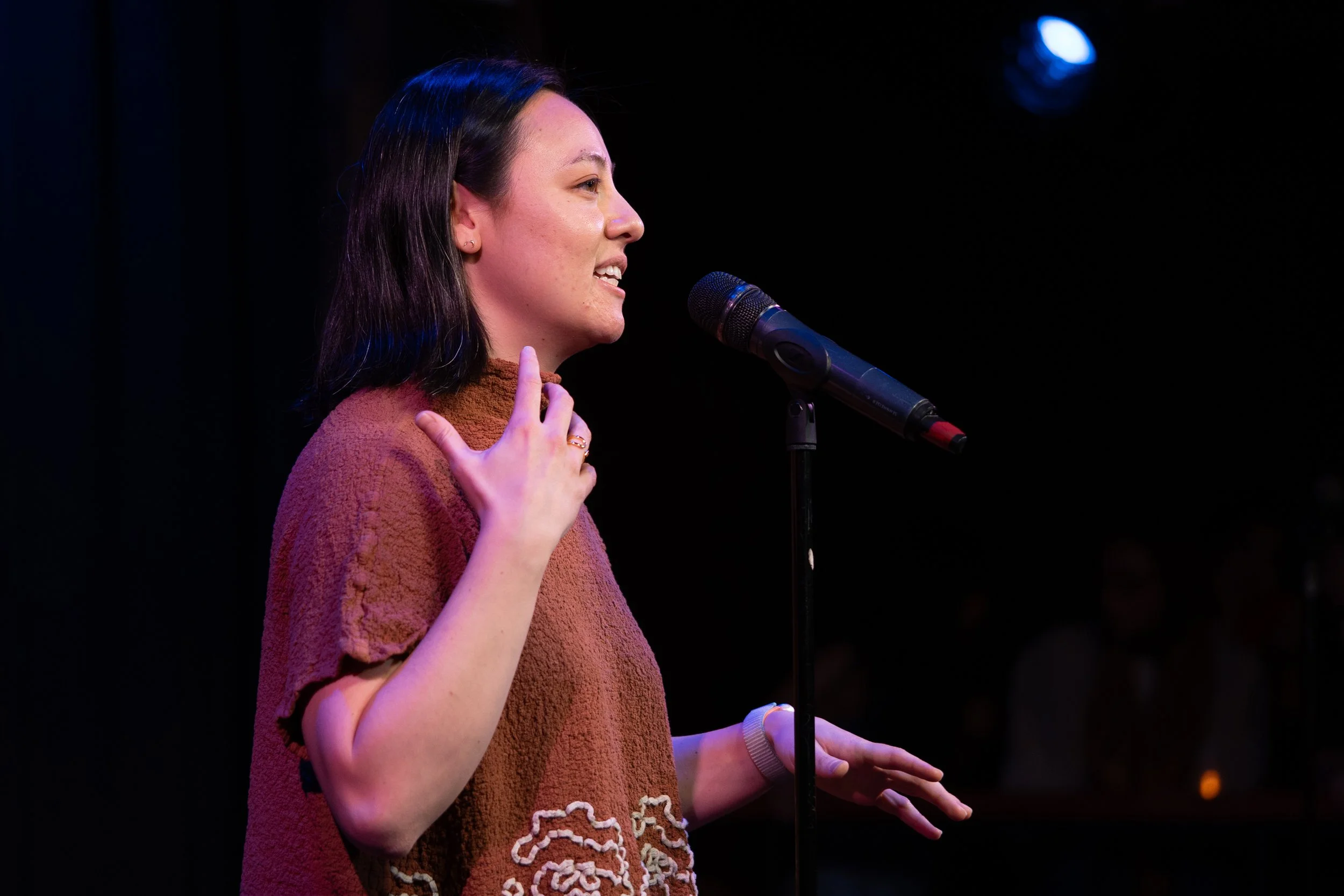 Leslie Sibener shares her story at Caveat in New York, NY in April 2025. Photo by Zhen Qin.