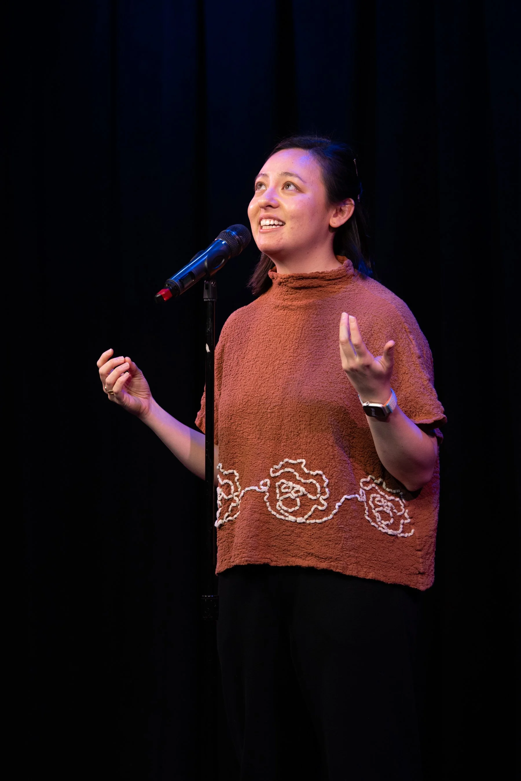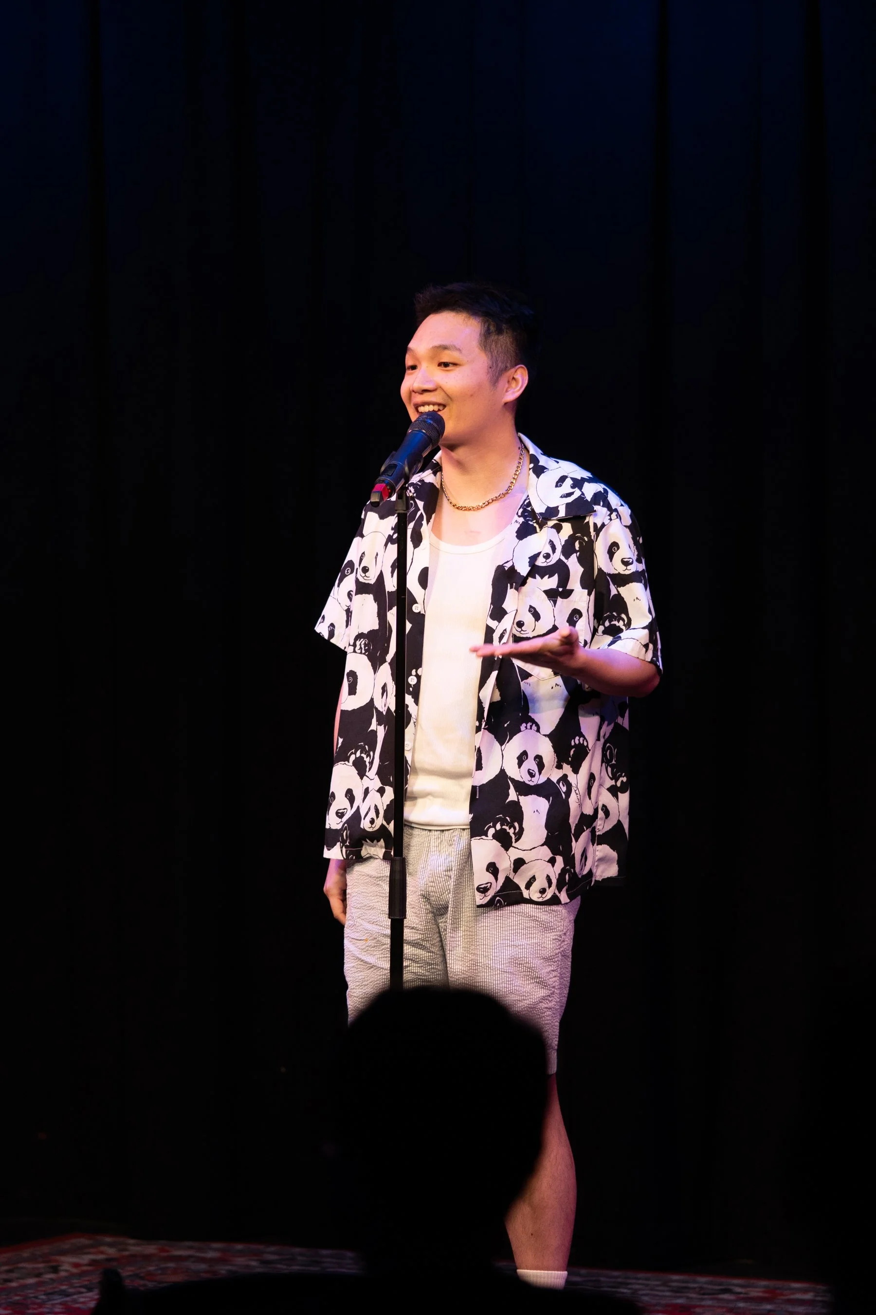 Jiawen Huang shares his story at Caveat in New York, NY in July 2025. Photo by Zhen Qin.