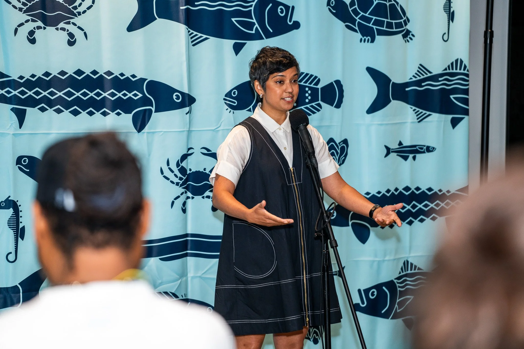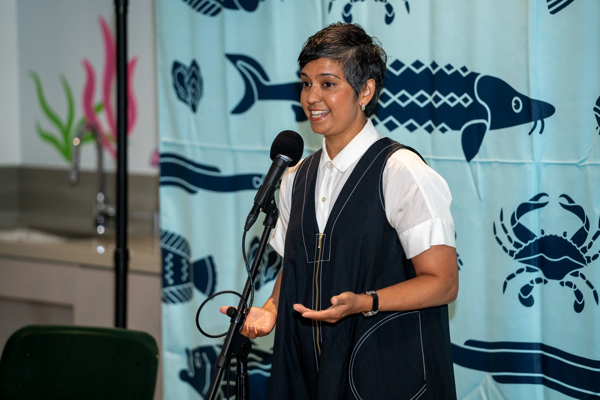 Sumitra Mattai shares her story at Pier 57’s Discovery Tank in New York, NY in September 2025. Photo by Jason Serrano.