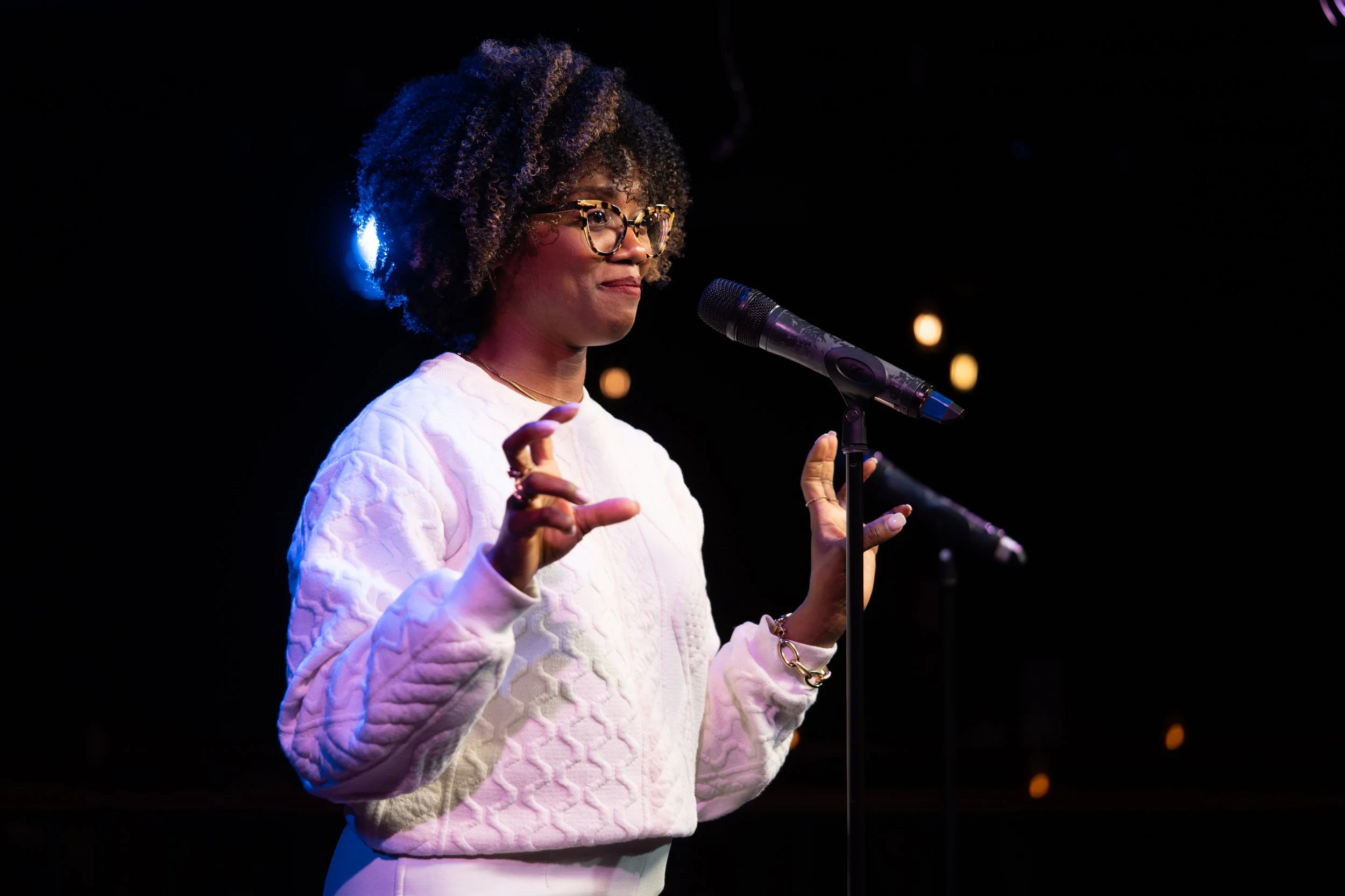 Yamilée Toussaint shares her story at Caveat in New York, NY in April 2023. Photo by Zhen Qin.