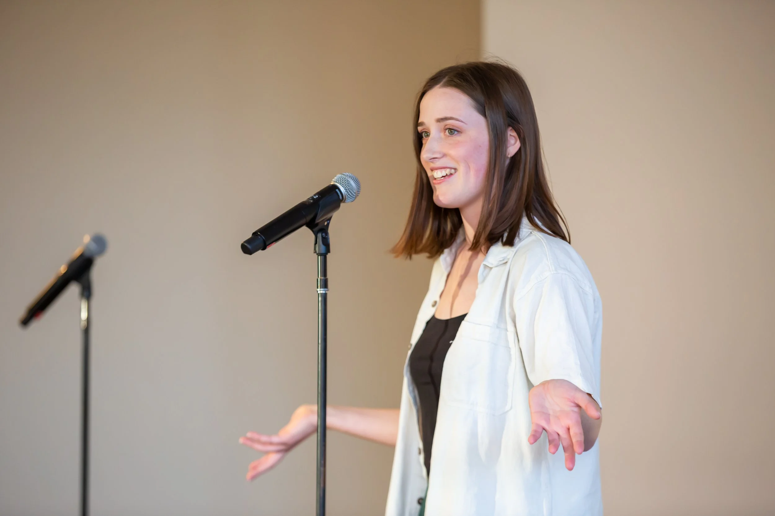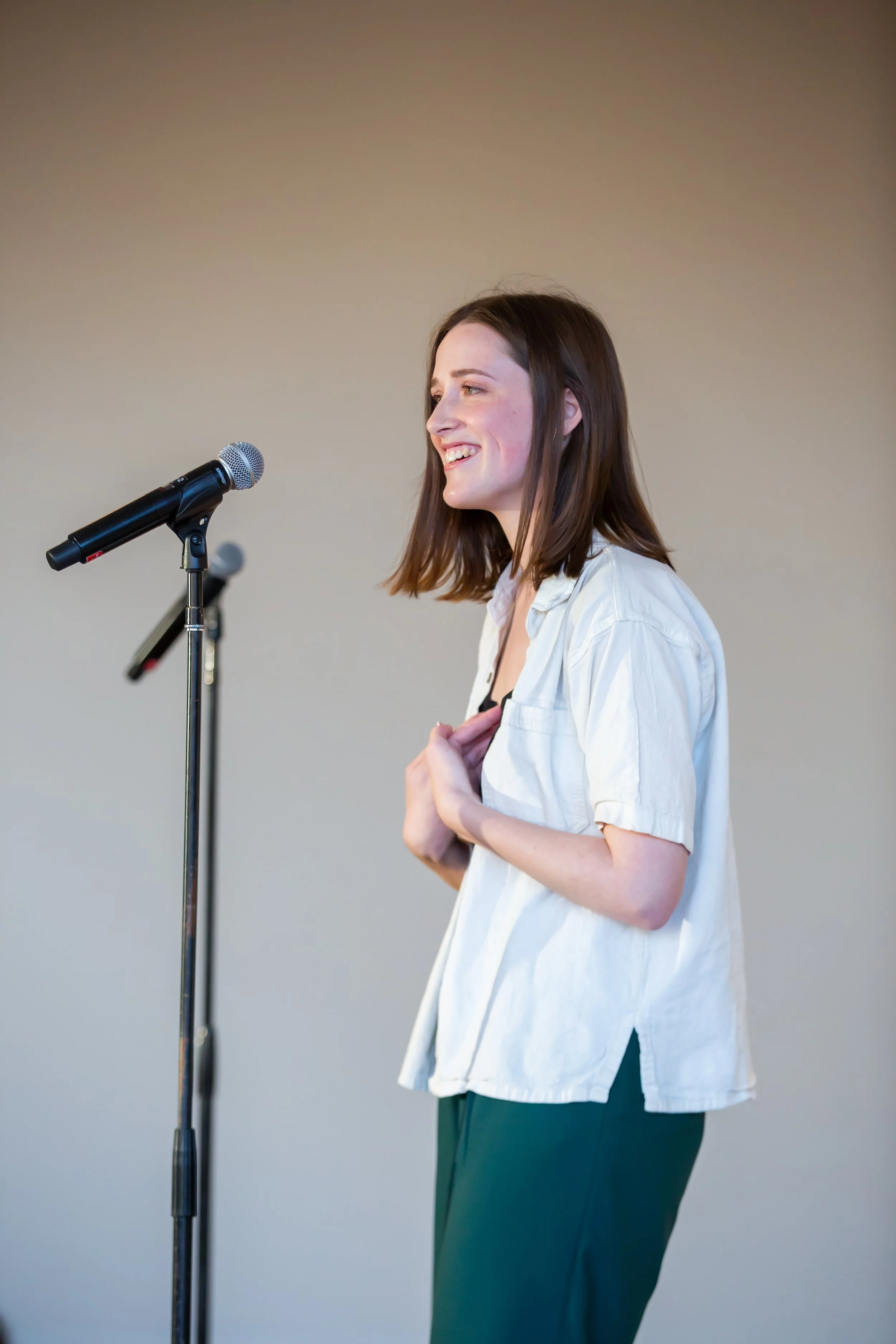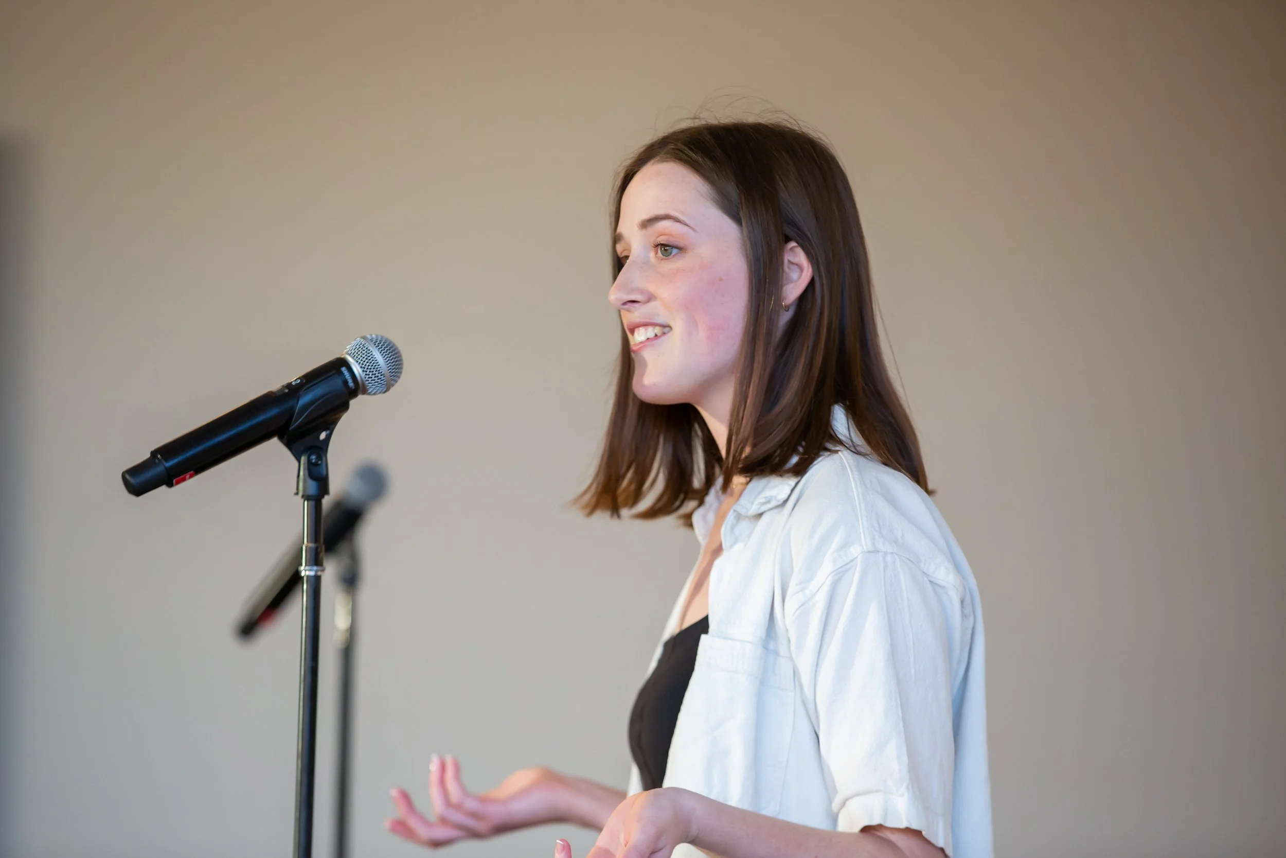 Hannah Melville-Rea shares her story at The Cantor Arts Center in Palo Alto, CA in April 2024. Photo by Christine Baker for Stanford Impact Labs.